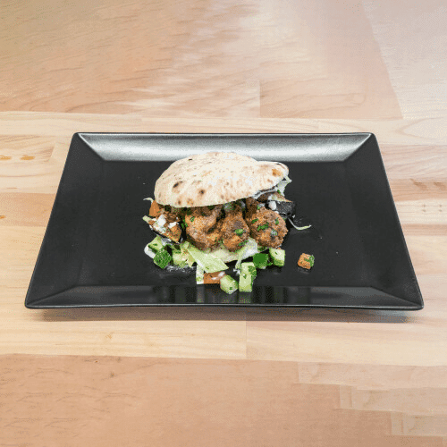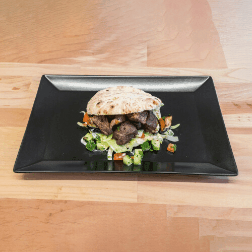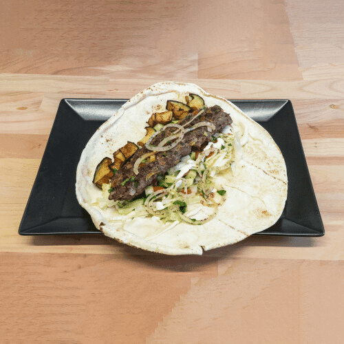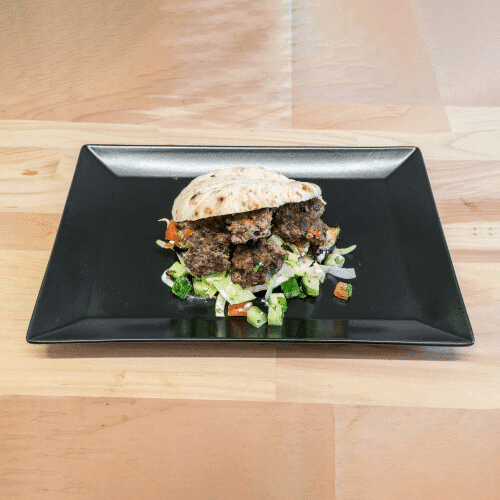 Zubereitet im Pita-Brot mit orientalisch gewürztem Rinderhackfleisch mit Petersilie, dazu Saucen und weitere Zutaten nach Wahl