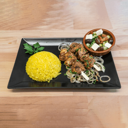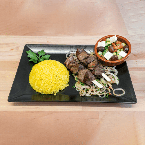 2 Lammspiesse, gewürzt nach orientalischer Art, serviert mit einer Beilage nach Wahl (Reis oder Pommes)