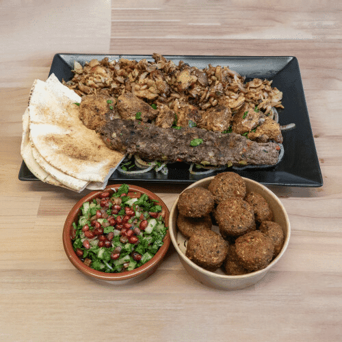 Eine Portion Shawarma, Kaftaspiess (1 Stück), Pouletspiess (1 Stück) und Lammspiess (1 Stück), serviet mit vier Mezzeschalen (à 3,75l) nach Wahl