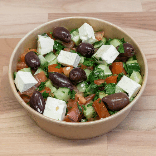Hirten-Salat aus Gurken, Tomaten, Oliven, Feta und Petersilien.