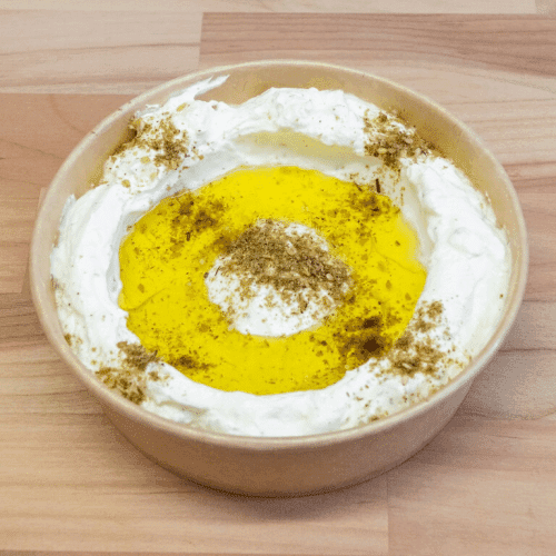 Orientalischer Frischkäse aus abgetropftem Joghurt. Wird mit Olivenöl serviert. Dazu feines arabisches Fladenbrot.