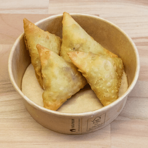 Dreieckige, leicht scharfe Teigtaschen. Gefüllt mit gewürzten Kartoffeln und Erbsen.