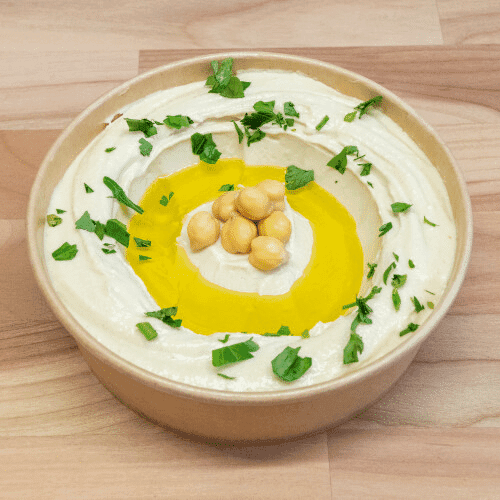 Kichererbsenpüree, mit Sesampaste, Knoblauch und Zitronensaft verfeinert. Wird mit Olivenöl serviert. Dazu feines arabisches Fladenbrot. (Vegan)
