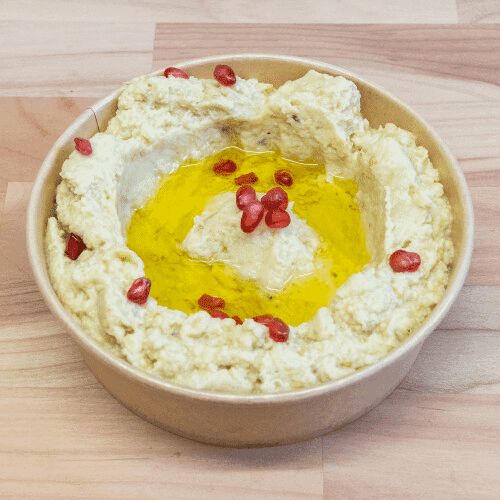 Gegrillte, gehäutete und pürierte Auberginen. Mit Sesampaste, Knoblauch und Zitronensaft verfeinert. Wird mit Olivenöl serviert. Dazu feines arabisches Fladenbrot. (Vegan)